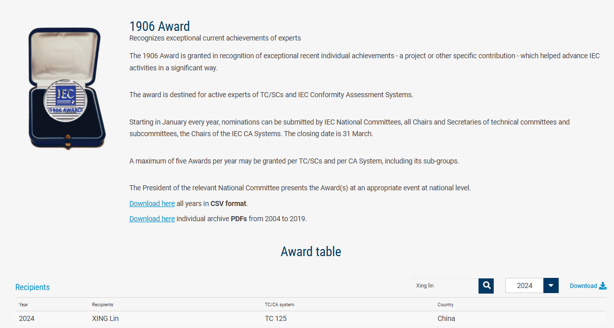 本次獲2024年度的IEC1906獎是基于在該領域產品移動性能標準化研究與制訂上實現了重大突破。
