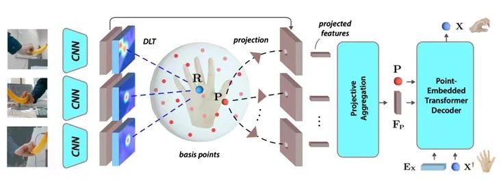 在自動(dòng)化標(biāo)注第一模塊中,針對(duì)復(fù)雜的靈巧操作手部姿態(tài)估計(jì)和跟蹤,項(xiàng)目組創(chuàng)新性地使用了空間基點(diǎn)集作為特征基,融合隨機(jī)多視角的觀測(cè),進(jìn)而通過(guò)點(diǎn)集注意力網(wǎng)絡(luò)輸出手部姿態(tài)控制點(diǎn),并以逆運(yùn)動(dòng)學(xué)重定向到同構(gòu)型雙臂靈巧機(jī)器人,完成相應(yīng)的操作任務(wù)。