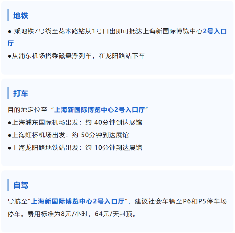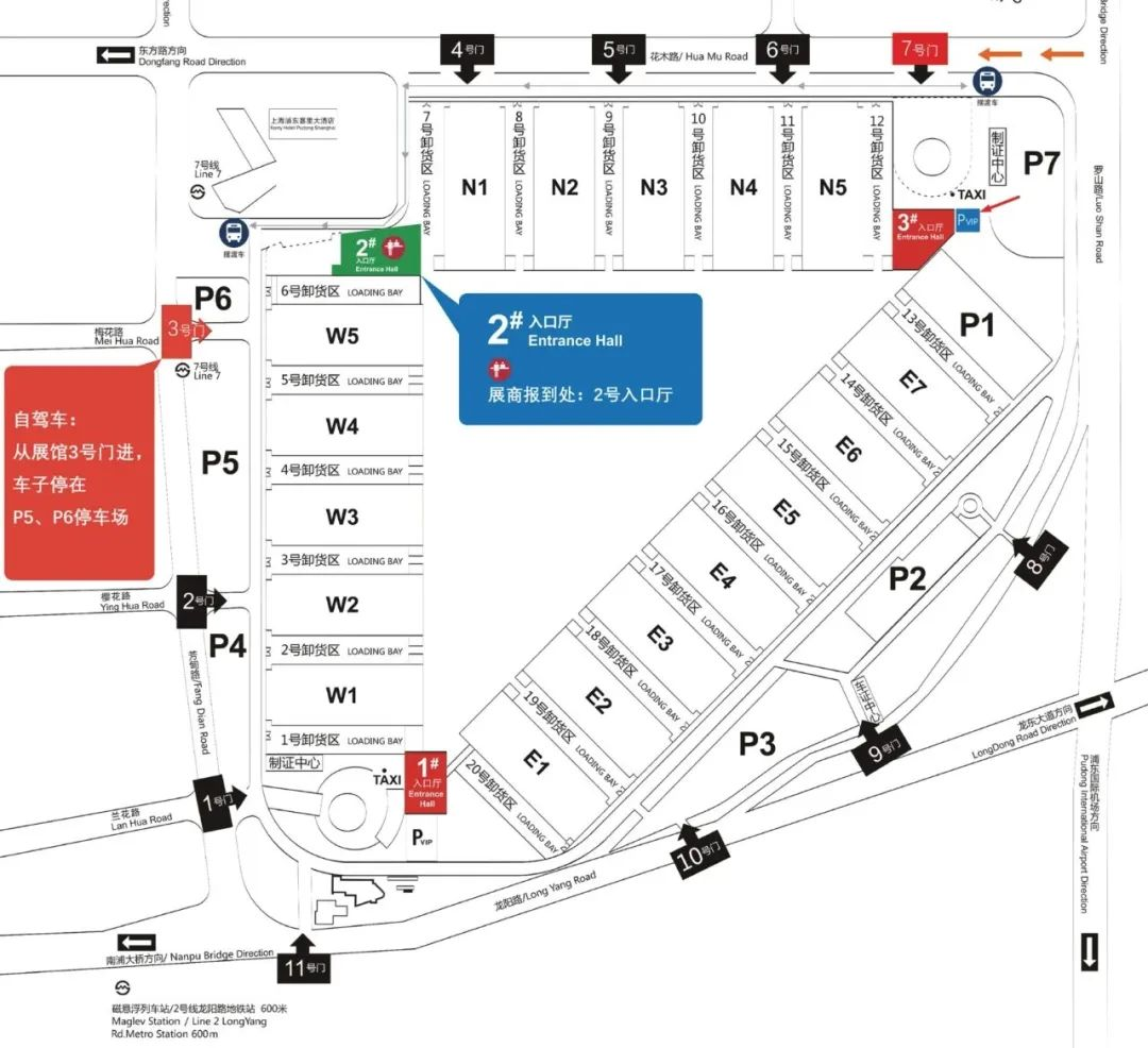 由上海新國際博覽中心“2號入口廳”進入展館(浦東新區龍陽路2345號,近地鐵7號線花木路站),本次展會僅開放2號登錄大廳(北廳),所有觀眾均在2號廳報到領取證件進入展館。