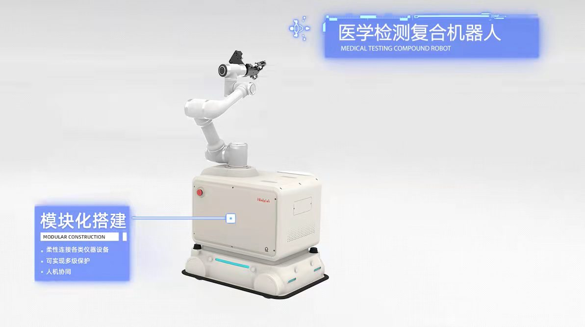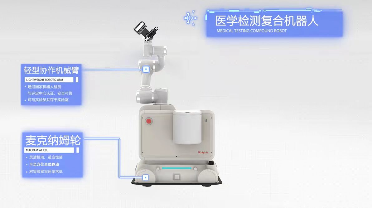 醫學檢測復合機器人以實際的檢測設備為依托,通過自主開發中控系統,在實驗室內進行模塊化搭建,柔性連接各類儀器設備。