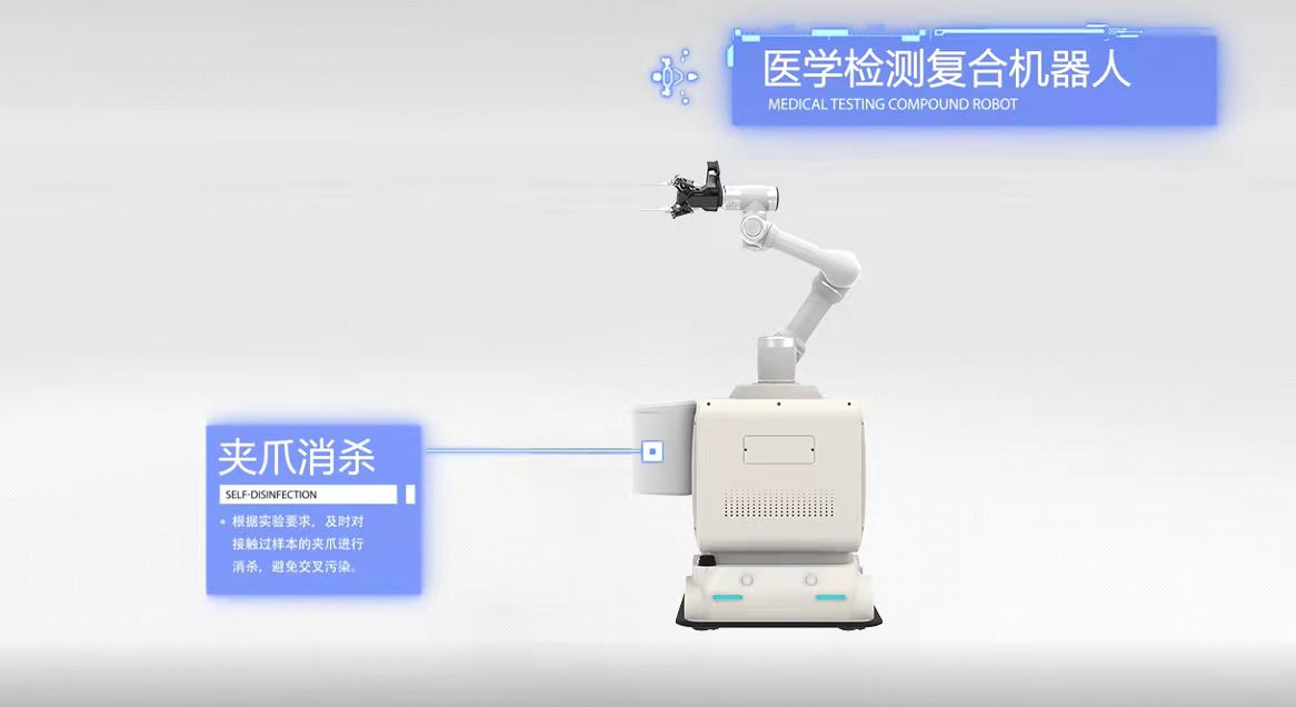 醫學檢測復合機器人具有獨特的外形和外部接口設計,自身可耐受多種類型的消殺,耐酒精噴灑、耐各種消毒液擦拭和紫外燈照射。開創性地配置夾爪消毒裝置,在作業過程中,隨時實現自我清潔,最大程度地避免了交叉污染。