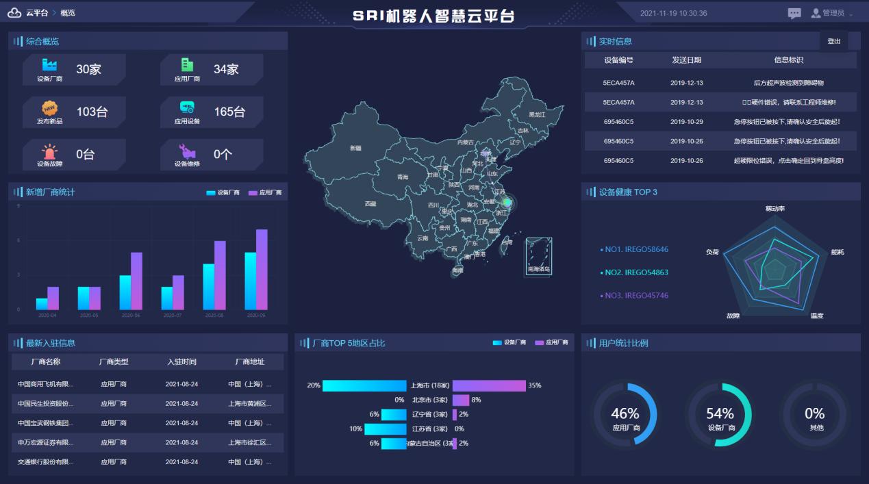主要用于機器人設備的生產廠商和應用廠商對各自生產與使用的設備進行實時的監控、分析和管理。通過云技術打破線下管理作業的繁瑣滯后等陳舊常規,實現機器人行業設備數據的實時共享與應用。具有如下功能: